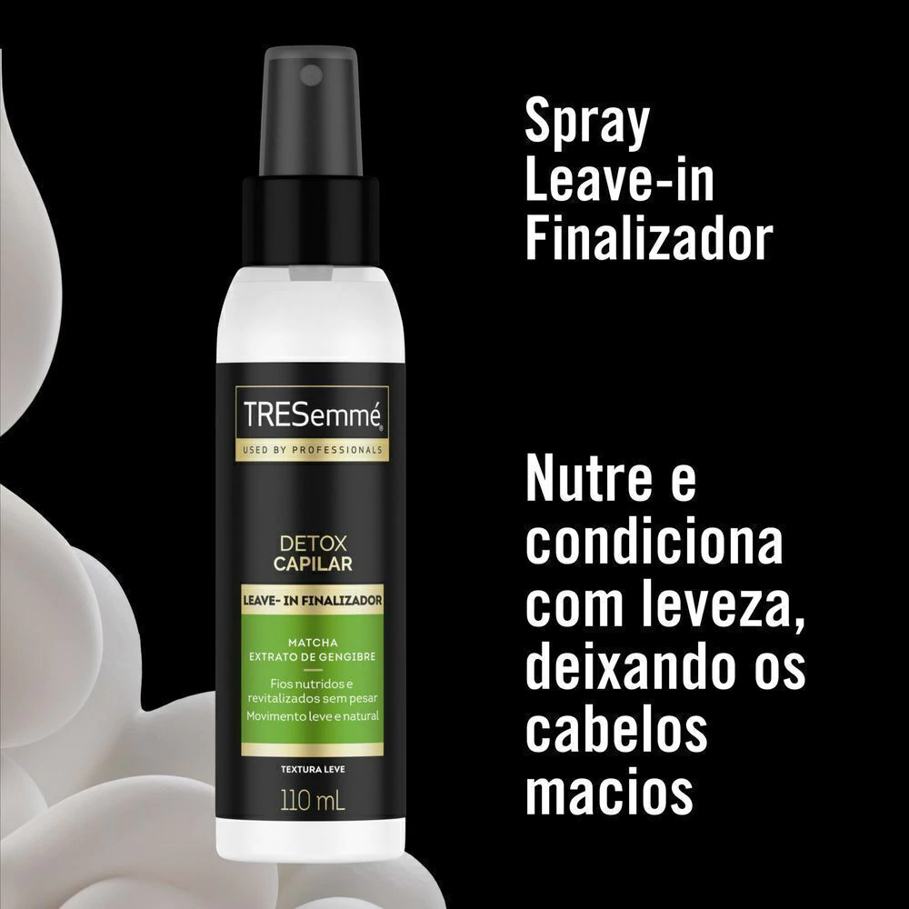 o O Spray Leave In Tresemmé Finalizador Detox Capilar, com matcha e extrato de gengibre, foi desenvolvido para promover um acabamento leve e com movimento aos cabelos o O spray Leave In Finalizador TRESemmé Detox Capilar nutre e revitaliza as fibras capilares, promovendo cabelos macios e com movimento leve e natural o Produto finalizador de cabelo que nutre e condiciona, sem pesar o O Spray Leave-In Tresemmé Detox Capilar condiciona com leveza, promovendo maciez o Spray para cabelo detox que proporciona um acabamento leve e com movimento, sem adição de parabenos e corantes, para cabelos revitalizados e nutridos o O Spray Leave In Finalizador TRESemmé Detox Capilar proporciona movimento leve e natural aos cabelos