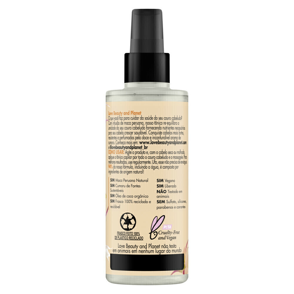 o Cabelos fortes e crescimento saudável, da raiz às pontas. o Com infusão de maca peruana nutre o cabelo, reequilibra e reidrata o seu couro cabeludo, fornecendo nutrientes para seu cabelo crescer saudável, em todo seu potencial. o Conquiste cabelos mais fortes, resistentes e perfumados pelo doce e inconfundível aroma de cumaru. o Com 97% da nossa fórmula, incluindo a água, composta por ingredientes de origem natural, vegana, e não testada em animais.* Love Beauty and Planet não testa em animais em nenhum lugar do mundo o Livre de Parabenos, Silicones e Corantes. o Recomendado para todos os tipos de cabelo.